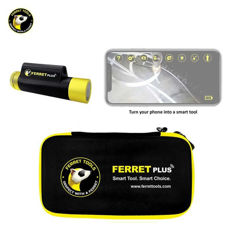 The Ferret Plus Inspection Camera brings you the ultimate innovation in inspection technology. It provides home inspectors the ability to view hard-to-reach areas that normal cameras, phones, and tablets can't. Take pictures or record videos of attics, crawlspaces, gutters, roofs, HVAC equipment, and other hard-to-reach areas. The Ferret Plus is the flagship camera of Ferret Tools. Unlike other Ferret Cameras, it includes built-in memory and the first ever non-contact voltage detector that is not handheld to help detect live cables from a greater reach than ever before.
