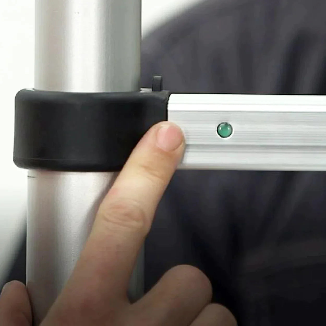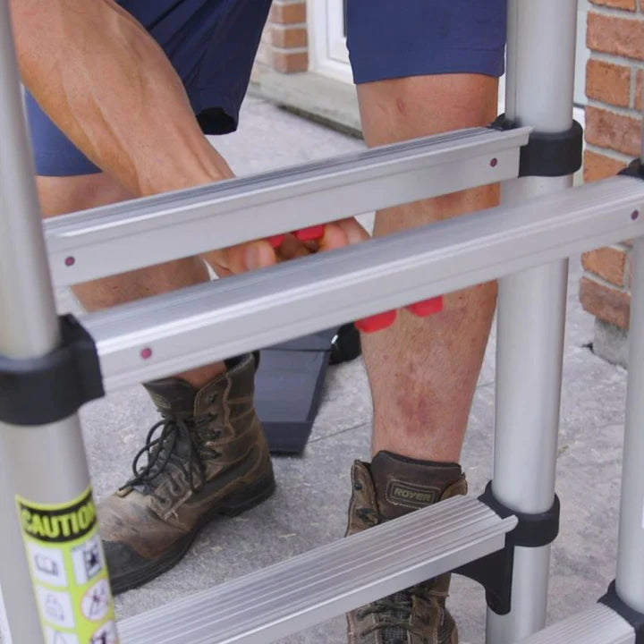 Once the ladder is locked in place, you can quickly and easily pinch the One Touch Release Buttons that will slowly lower the rungs back to it’s original compact size. No physical tug of war, no use of tools…just a simple pinch, to lower inch by inch!