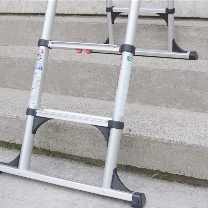 The ES Combination series has a stair feature. Move the Retainer Block from the bottom rung to a higher rung on the back side of the ladder. Press it underneath the rung. Then pinch the red buttons together and raise the base so it meets the Retainer Block and can fit on a staircase.