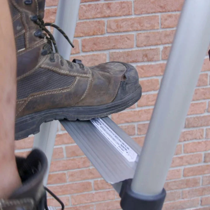 The EP Series features the wide Pro Step, for professional use. The steps are a comfortable 3 5/8” wide, ribbed for grip and angled at 75% so Contractors feet are always flat and level on the rung of the ladder.